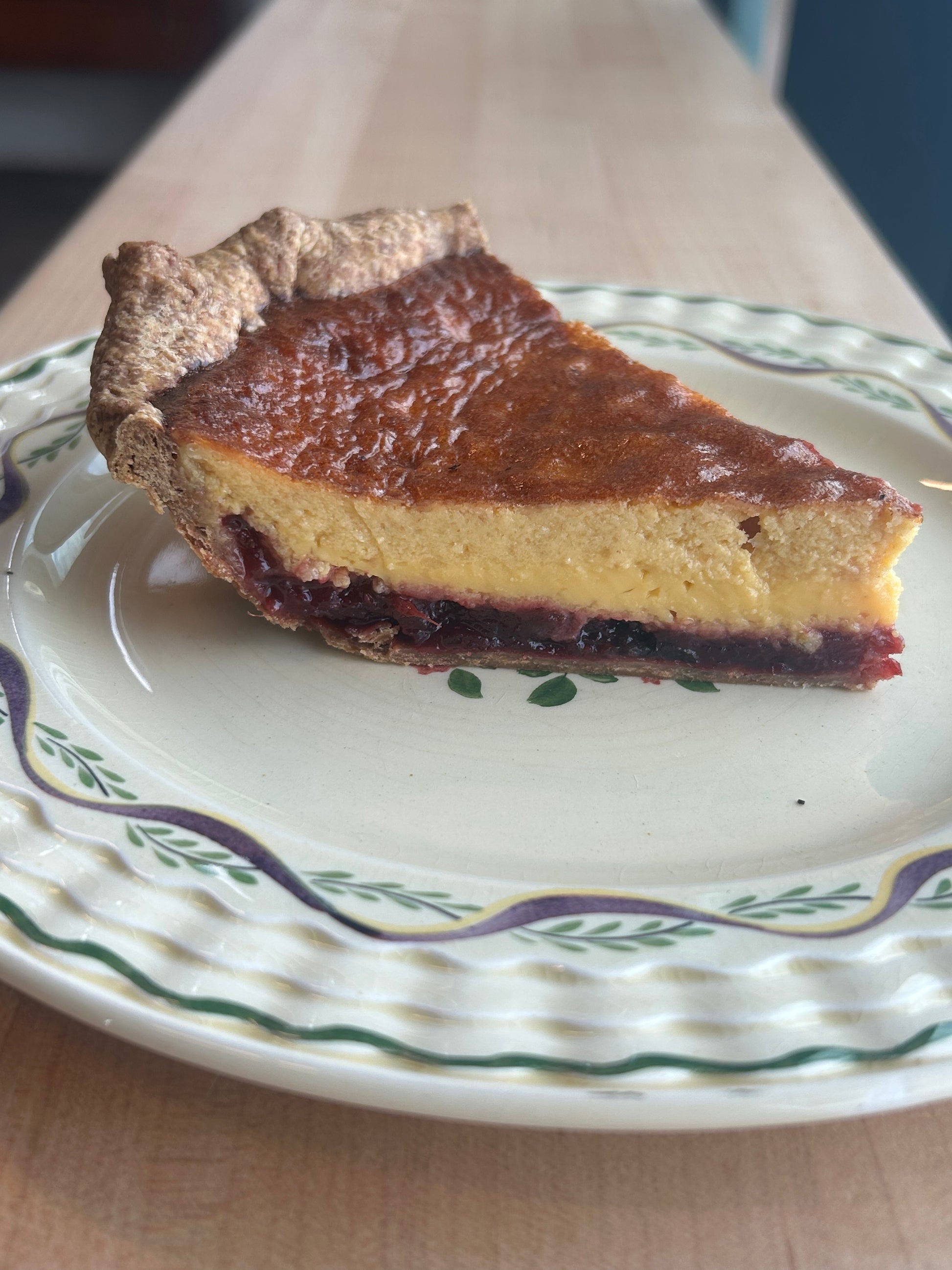 This Northeast honey and grass fed buttermilk pie has a creamy, tangy, and rich chess top that's contrasted above a tart, bright, jam made with Vermont cranberries. The pie is the perfect end to a holiday party or meal.